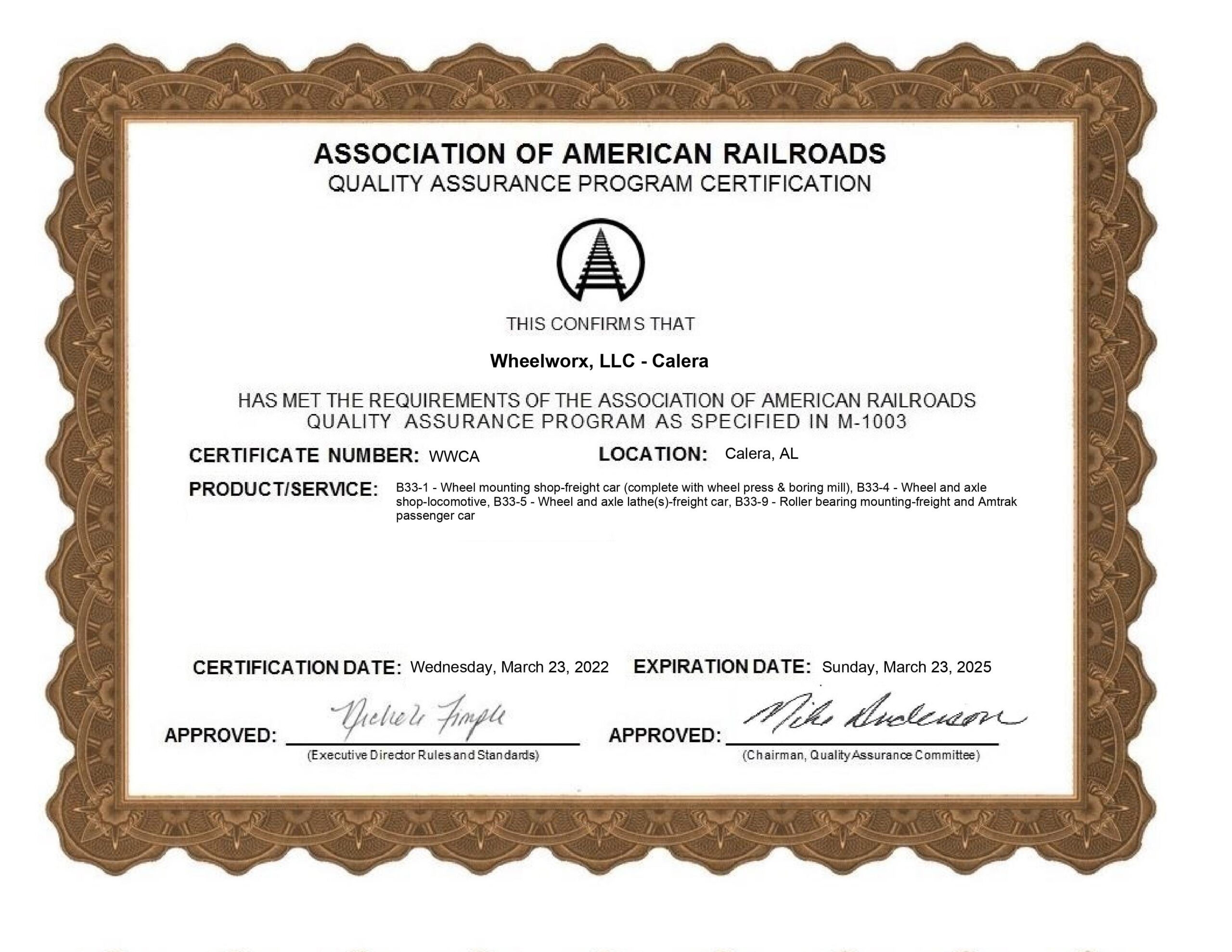 AAR Quality Assurance Program Certification – Calera
