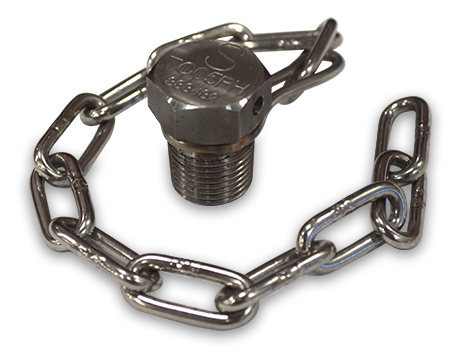 Salco Products (TC054PAH) 1/2-inch Stainless Steel Plug Assembly with Stainless Steel Chain consists of a plug that has 1/2-inch NPT threads, and is made out of 416 stainless steel material with a 3/16-inch seal hole drilled through the head. The width across the flats of the head is 1-inch. Length of the thread is .63-inches with the overall length of the plug being 1.34-inches. Comes with a stainless steel chain assembly that consists of a 1/4-inch, 304 stainless steel, swivel link that is crimped around the plug, and is connected to a 1/4-inch, 18-8 stainless steel, chain of 12 links.