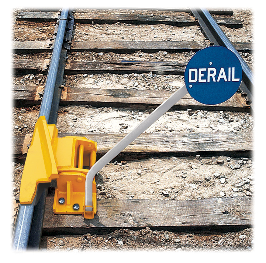 2-way freight car hinged derail with manual lift sign. Blue "DERAIL" sign and holder included. Weight: 156-pounds. Can be padlocked...