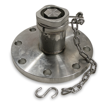 Salco Products (TE2SDLP07FAW) 2-Inch Flanged Stainless Steel Top Fitting Assembly, Black Viton B Gaskets fits an outlet with eight (8) 7/8-inch bolt holes on a 8-1/2-inch bolt circle. The flange is made out of 316L stainless steel features a 2-inch NPT and 2-3/4-inch 6 UN -2A threads. The 2-inch quick connect thread on cap with wrench protector is made out of 316L stainless steel, and features slot cut in threads for pressure relief. Comes with 1/4-inch by 2-1/2-inch, 18-8 stainless steel S-hook, a 304 stainless steel lock ring, Two (2) 1/4-inch SAE, 18-8 stainless steel flat washers, a 1/4-inch by 1-1/4-inch, 18-8 stainless steel, hex bolt, a 1/4-inch, 18-8 stainless steel, hex lock nut, and 3/16-inch, 18-8 stainless steel, chain link with 14 links. Comes with a black Viton B dust cap and flange gasket.