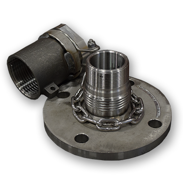Salco Products (TE20S75DLP07A) 2-Inch Flanged Stainless Steel Top Fitting Assembly, fits an outlet with four (4) 1-inch bolt holes on a 7-1/2-inch bolt circle. The flange is made out of 316L stainless steel features a 2-inch male NPT and a 2-3/4-inch 6 UN -2A thread. The 2-inch quick connect thread on cap with wrench protector is made out of 316L stainless steel, and features slot cut in threads for pressure relief. Comes with 1/4-inch by 2-1/2-inch, 18-8 stainless steel, S-hook, a 304 stainless steel lock ring, two (2) 1/4-inch SAE, 18-8 stainless steel, flat washers, a 1/4-inch by 1-1/4-inch, 18-8 stainless steel, hex bolt, a 1/4-inch, 18-8 stainless steel, hex lock nut, and a 3/16-inch, 18-8 stainless steel, chain link with 14 links. Comes with a black Viton B dust cap gasket.