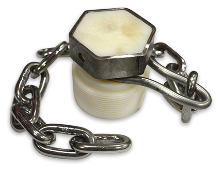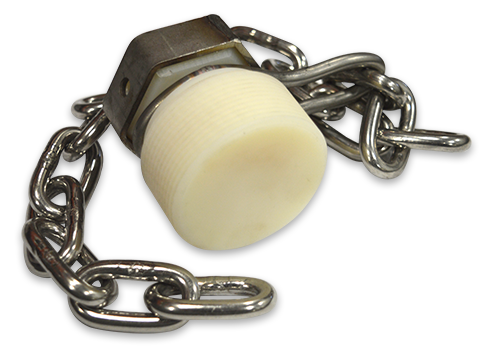 Salco Products (TC2NYPA) 2-inch Nylon Plug Assembly with Seal Hole and Carbon Steel Chain consists of a plug that has 2-inch NPT threads, and is made out of Nylon material. It features a 9/32-inch seal hole drilled through the head as well as a plug head protector made out of 304 stainless steel. The width across the flats of the head is 2-3/16-inches. Length of the thread is 1-1/8-inches with the overall length of the plug being 2-1/2-inches. Comes with a carbon steel chain assembly that consists of a 1/4-inch, carbon steel, swivel link that is crimped around the plug, and is connected to a 1/4-inch, carbon steel, chain of 15 links with an approximate length of 19-inches.