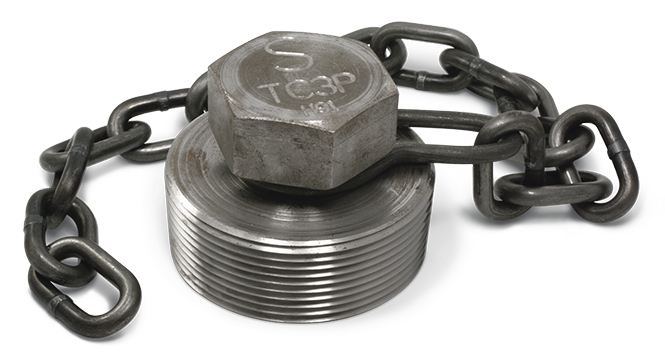 Salco Products (TC3PA) 3-inch Carbon Steel Plug Assembly with Carbon Steel Chain consists of a plug that has 3-inch NPT threads, and is made out of carbon steel material. The width across the flats of the head is 2-1/8-inches. Length of the thread is 1.38-inches with the overall length of the plug being 2.69-inches. Comes with a carbon steel chain assembly that consists of a 1/4-inch, carbon steel, swivel link that is crimped around the plug, and is connected to a 1/4-inch, carbon steel, chain of 15 links with an approximate length of 19-inches.