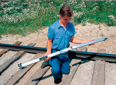 Adjustable aluminum level and gauge features a 3-piece design, 56 inches to 58 inches gauge range. An economical way to measure two inches of gauge variation to 1/16 inch accuracy. Slide rule action and large type scale for easy reading. Gauge setting can be locked with thumb screw. Also measures cross elevation from 1 to 7-inches with 1/8-inch accuracy. Weight: 11 pounds. Product of Aldon ® Company