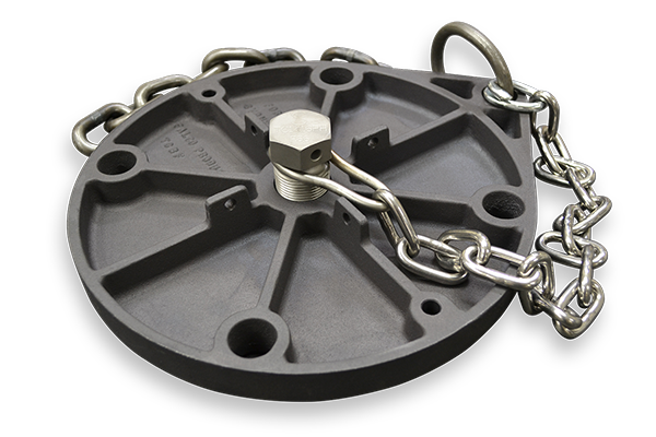 Fits Standard 6″ Bottom Outlet, (4) 7/8″ Bolt Holes on 9 1/2″ Bolt Circle, Black Anodized Aluminum, White FDA Nitrile Gasket, 416 SS Plug, CS and SS Chain