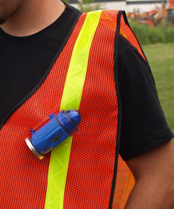 Clip-on/ stick-on flashing blue light. Features a magnetic base. Can be clipped to shirt pocket for worker’s protection. Height: 4-1/2 inches. Weight: 1/2 pound. Uses single “D” cell battery and features a Xenon bulb. Product of Aldon ® Company.