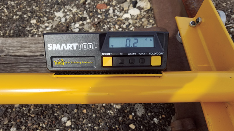 Digital track level attaches with velcro to either the Economy Rolling Track Gauge Reader (4022-10) and Roadmaster Rolling Gauge Reader (4022-14). Liquid crystal display has 1/2 inch numerals readable from 10 feet away. Measures elevation in 10ths of an inch per foot. Weight: 5 pounds. Product of Aldon® Company
