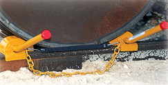 Whack 'Em double railroad wheel chock with flag and replaceable rail biting spurs. For exposed rail. Severe duty wheel chocks...