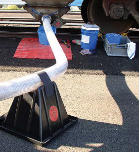 Keep loading and unloading hoses off the ground with hose supports for railcars and trucks.