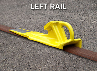 Low height chocking skid for left rail (as viewed from the handle end of the skid). 4-inches high at handle end and 17-1/2-inches long. Tamper-proof, light-weight skid for blocking one end of parked freight car. Rail skid uses friction from wheel pressure to hold car steady. For flush rail. Use on flat track. When using rail skid at one end of freight car, always chock other end of car with conventional steel wheel chock. Place skid in front of wheel, then roll wheel up onto skid. Apply car or locomotive brake after skid is under the wheel. Weight: 16 pounds. Product of Aldon® Company.