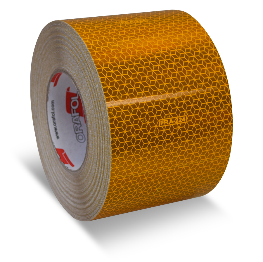 ORALITE® (R4X150RY) Reflective Tape Roll is 4 inches wide with kiss cuts every 18 inches, and are a solid yellow color. Feature a .008 inch thin, single ply, no open-cell construction. They are ideal for marking sides of rail cars. Come in a roll of 150 feet. FRA-224 compliant.
