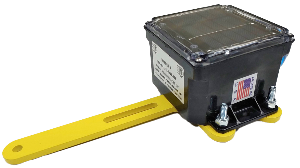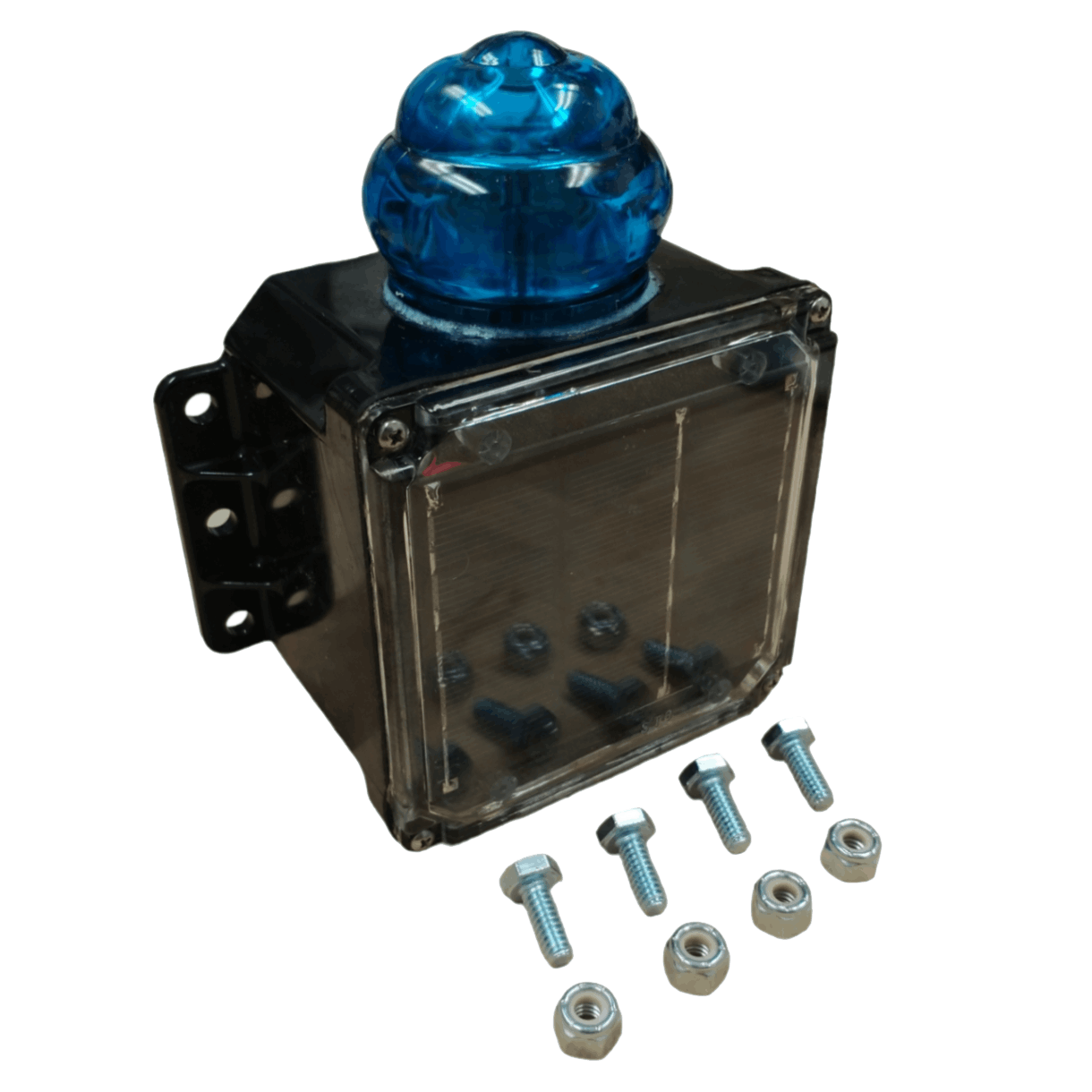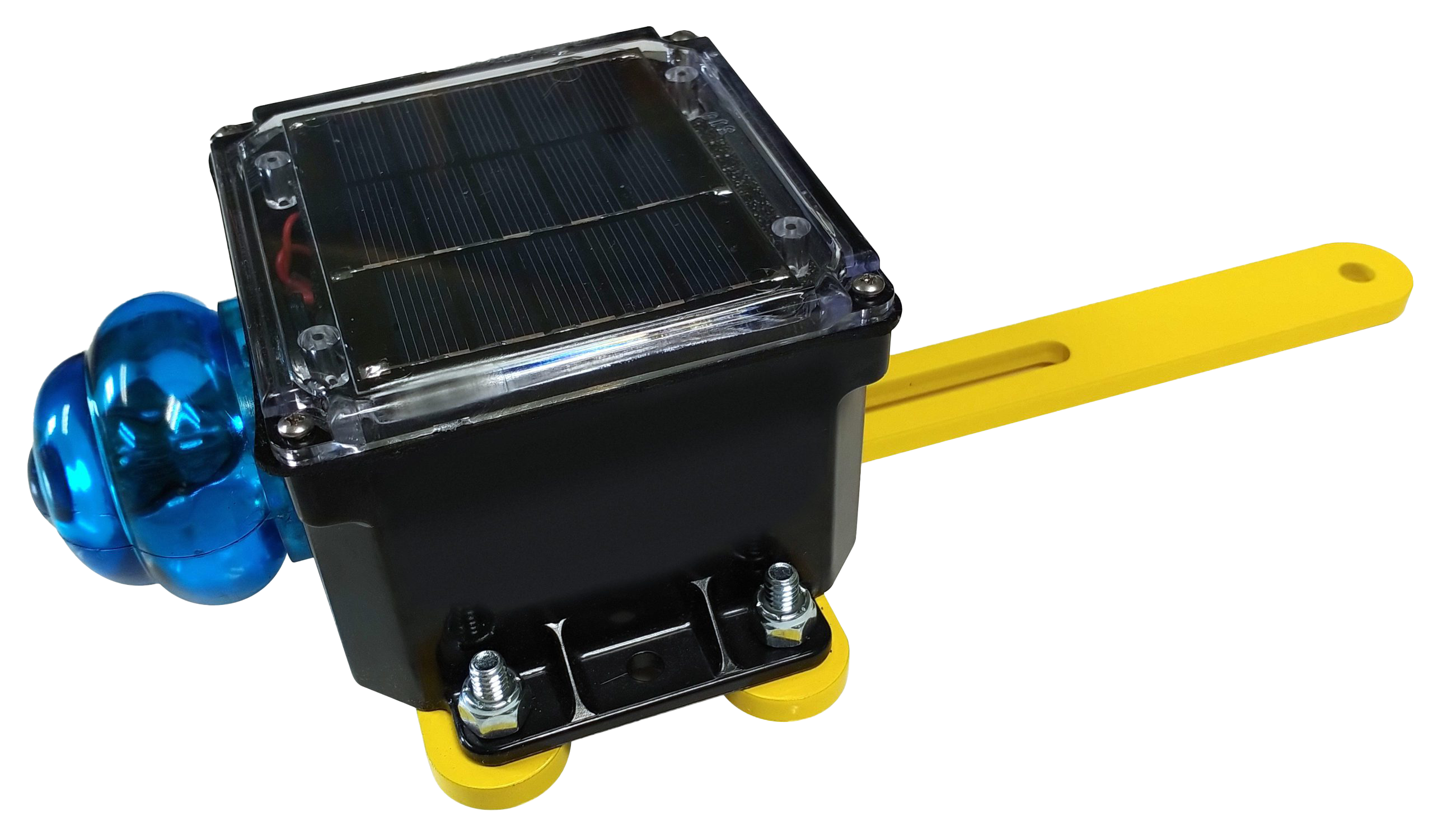 Solar Powered blue flashing light. Shock-proof and weather-tight. Gravity switch activates the light when sign holder is at 45 degree angle or greater. Brilliant 6-LED light visible for over a mile. Mounting bracket provided. Bolt to sign holders or derail sign holders. Product of Aldon® Company.
