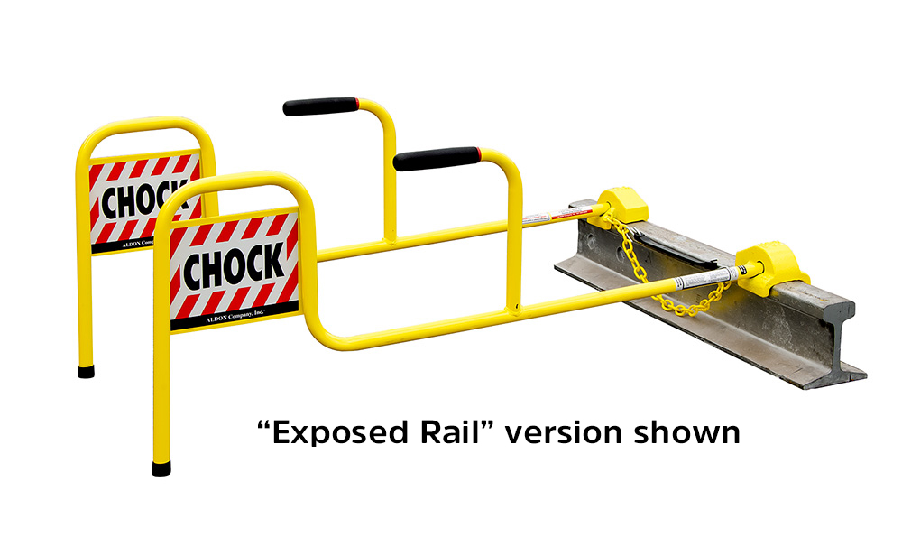 High visibility, ergonomic, double railroad wheel chock with flag and replaceable rail biting spurs. For flush rail. Worker can stay clear of rail car when installing or removing these wheel chocks. Handle length of 44-inches provides easy observation of chock in place by locomotive crew and dock workers. All steel casting with replaceable rail-biting steel spurs. Weight is 26-pounds. Product of Aldon® Company.