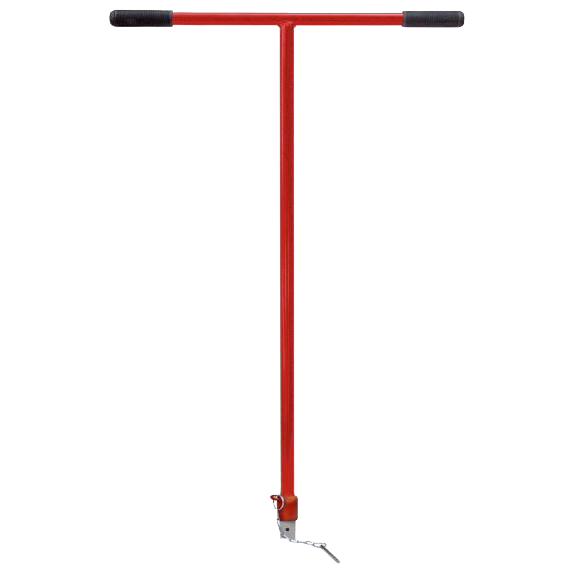 Steel T-handle wrench for tank car sockets. Special 2-foot length. Useful where 200 foot/pounds or less torque is needed to loosen or tighten manway cover bolts. Handle is 18-inches wide with a 24-inch tall staff. 1-inch square drive. 1-inch outer diameter handle. Safety chain with locking pin to secure socket to wrench. Weight: 12 pounds. Product of Aldon ® Company.