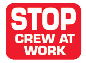 STOP CREW AT WORK red sign plate. White letters on a red background. Sign plates are 12-inches by 15-inches, and made of .080-inch aluminum plate with Scotch-Lite reflectorized lettering. Weight: 1.5 pounds. Product of Aldon ® Company.