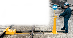 Two-way retractable derail is stationary, and a sliding type. Fits 40+ pound rail. More convenient than a hinged derail. Derail shoe slides in and out of housing through the leverage of a waist-high operating lever. No need to bend or stoop to activate, or deactivate the derail. Work from a comfortable standing position alongside the track. Broad deflection angle derails six-axle locomotives as well as smaller locomotive, and freight cars. Derails in both directions. Derail is supplied with high-rise operating stand, connecting rod and blue derail sign. Customer furnishes two 14-foot wooden crossties to support derail and stand. Weight: 525 pounds. Product of Aldon® Company.